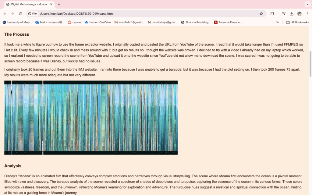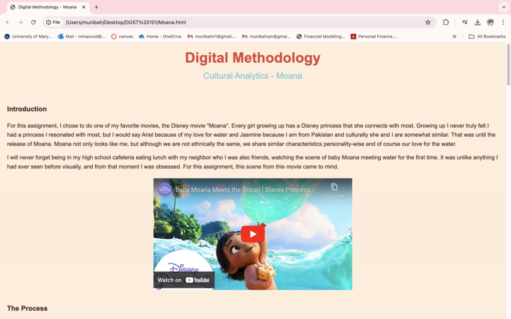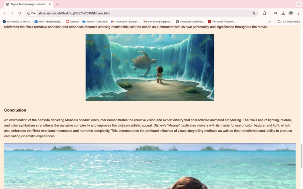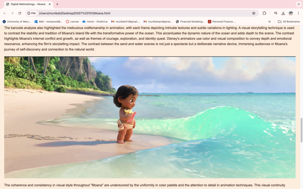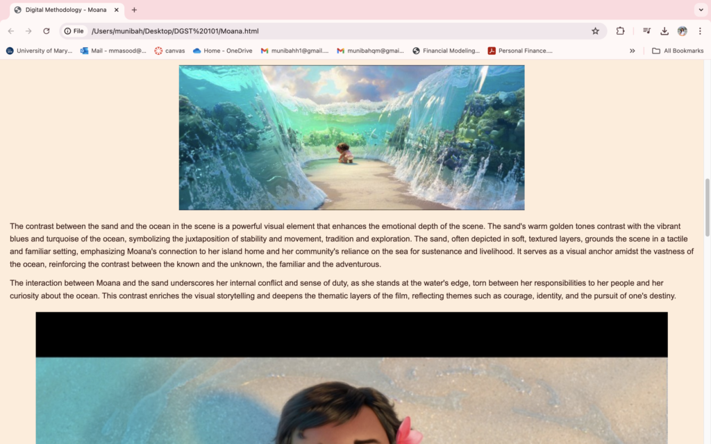 The pivotal moment came when I used my developing HTML abilities to create a specialized webpage that examined Moana. By using textual analysis, visually striking graphics, and an embedded moving YouTube movie, I was able to see my idea come to life on screen. It was a moment of technical achievement and creative fulfillment.