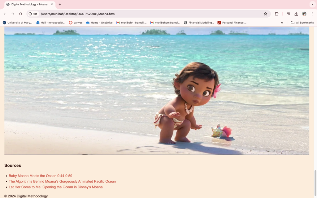 Starting with a blank canvas, my initial steps into HTML were very tentative knowing I do not do well with coding applications. I started by immersing myself in understanding the fundamental building blocks of web development – from grasping HTML tags and elements to structuring content effectively. Each element I learned, whether it was for sections or a for images, felt like unlocking a piece of a larger puzzle. The journey had many hurdles. Creating a webpage that would capture and share insights into this beloved Disney film “Moana” was an exciting endeavor that unfolded with both challenges and triumphs. The goal was to create a webpage that would capture and share insights into this film.